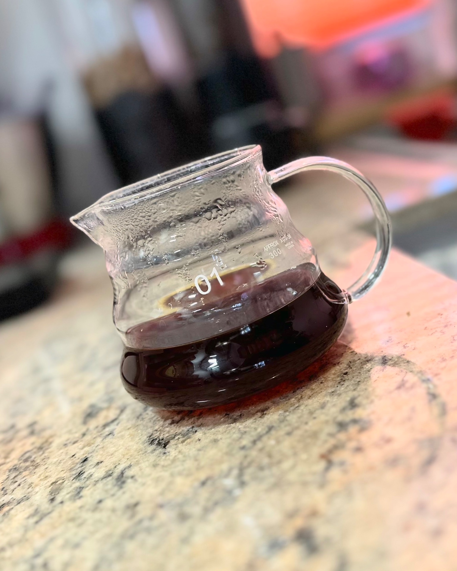 Im Café selber wurde der Kaffee in einem Flat Bottom Filter zubereitet, ich habe einen V60 genutzt. In beiden Fällen würde ich diese Bohnen als sehr unauffällig bezeichnen, dennoch aber total lecker. Die Mandarine schmecke ich raus, die Süße kann ich auch einem Pfirsich zuordnen, mir fehlt aber die “Saftigkeit”; Die Weiße Schokolade habe ich nicht geschmeckt. Für mich hat sich ein wenig Schwarzer Tee reingemischt, aber sehr weit im Hintergrund. Die Säure ist total angenehm, fast schon erfrischend.