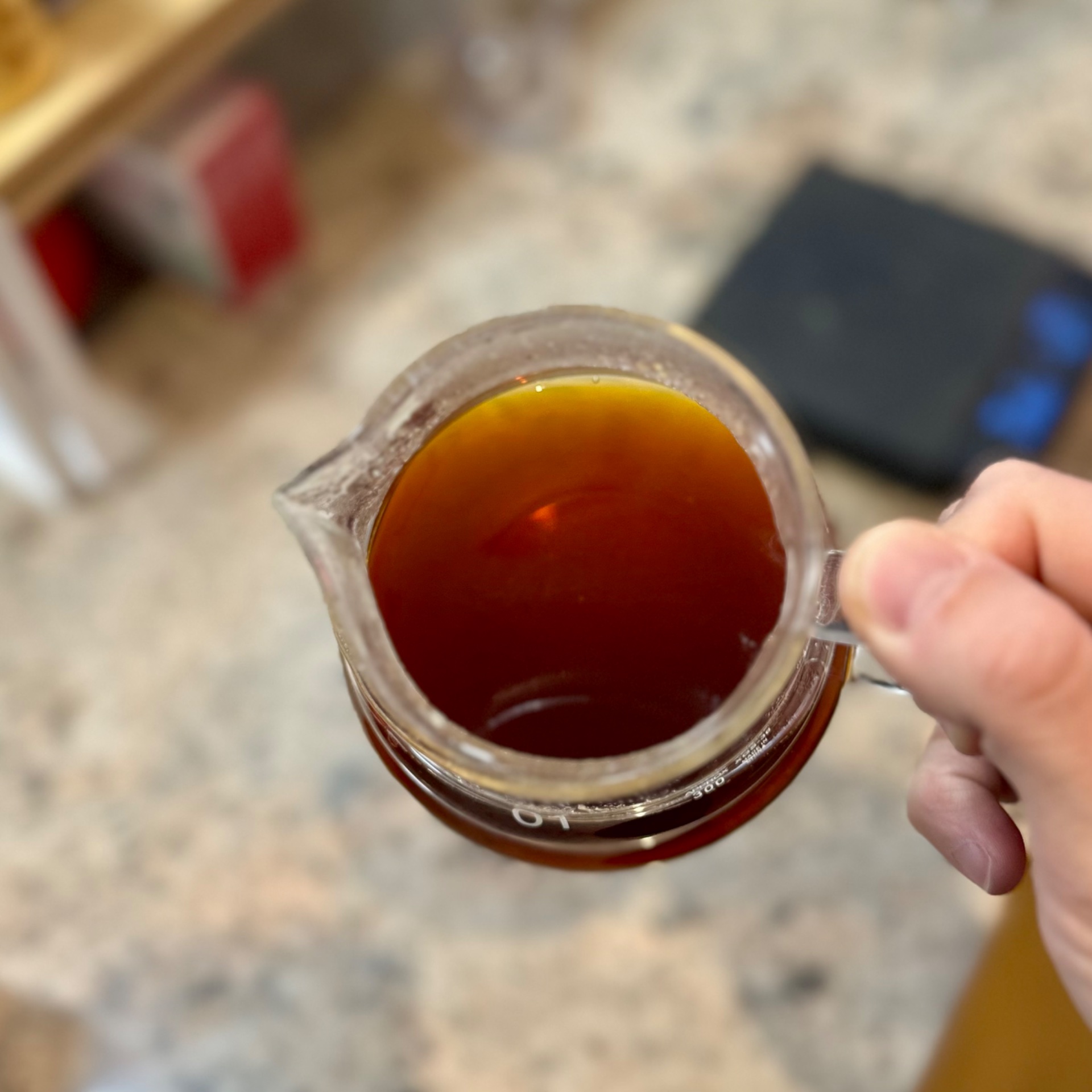 Also: Standard Rezept genommen, V60 vorgewärmt und die Mühle geschwungen! In der Tasse befindet sich anschließend ein Kaffee, der dunkler als erwartet riecht und schmeckt, aber dennoch keine reine Schokolade ist. Ich bin wahrlich niemand, der einen gut ausgebildeten Geschmackssinn hat, ich kann aber durchaus behaupten, dass ich neben der Schokolade (nicht all zu dunkel) auch Früchte bzw. deren Süße schmecke. Weniger spitz wie bei einer Zitrone, eher in Richtung Mange, aber nicht ganz so saftig. Je kühler er wird, desto präsenter wird auch die Säure. Dafür kommt noch was süßes hinzu, was ich mit einem sehr dickflüssigem Honig bzw. Bonbons die nach Honig schmecken sollen, vergleichen mag. Das habe ich so nicht erwartet, ich freue mich aber bereits auf die nächste Tasse!