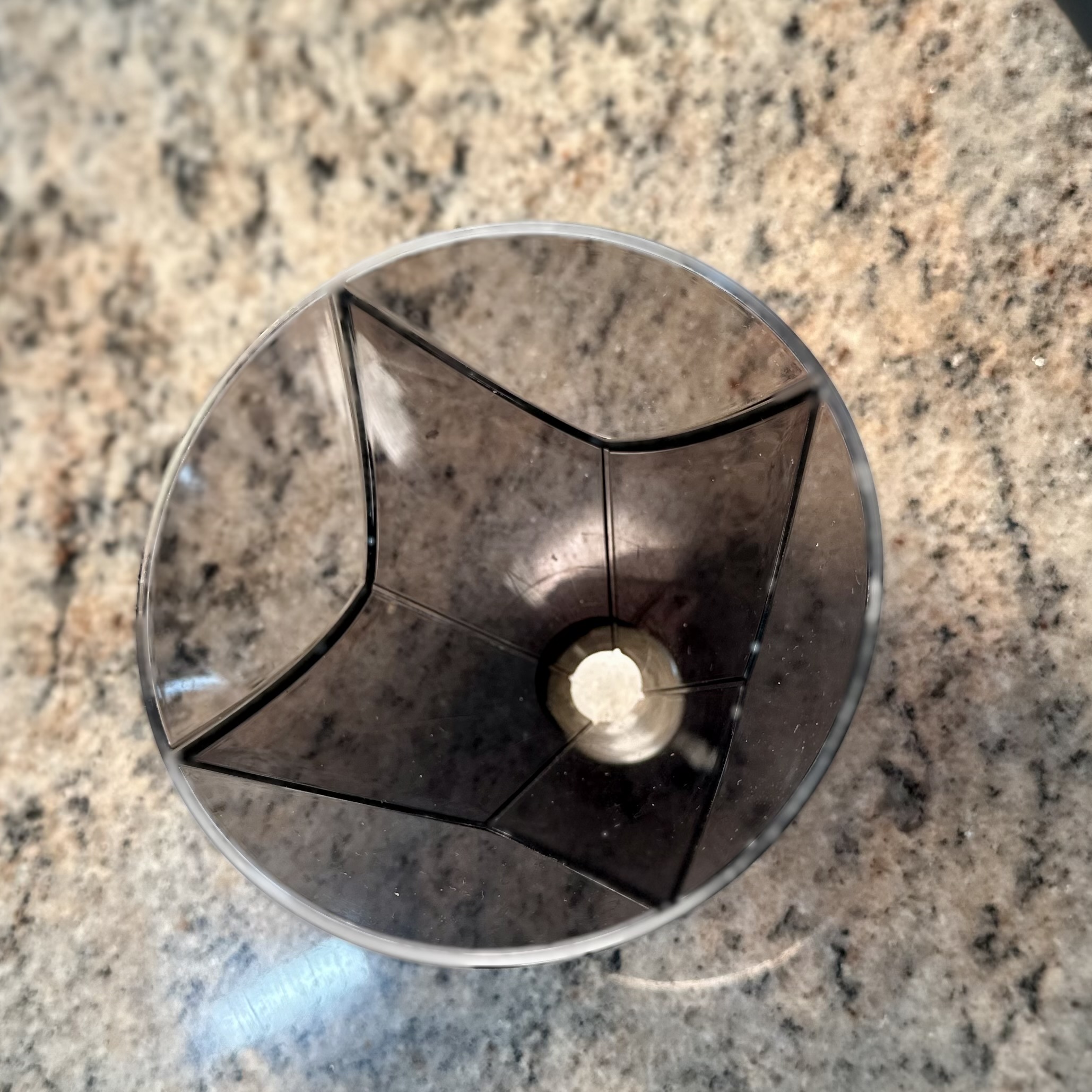 Für mich der wichtigere Punkt ist aber, dass der Filter nur an wenigen, dünnen senkrechten Streben Kontakt zum Filterhalter hat. Dadurch wird der Wasserfluss am Kaffee vorbei nicht all zu intensiv befördert, aber auch nicht gänzlich verhindert.