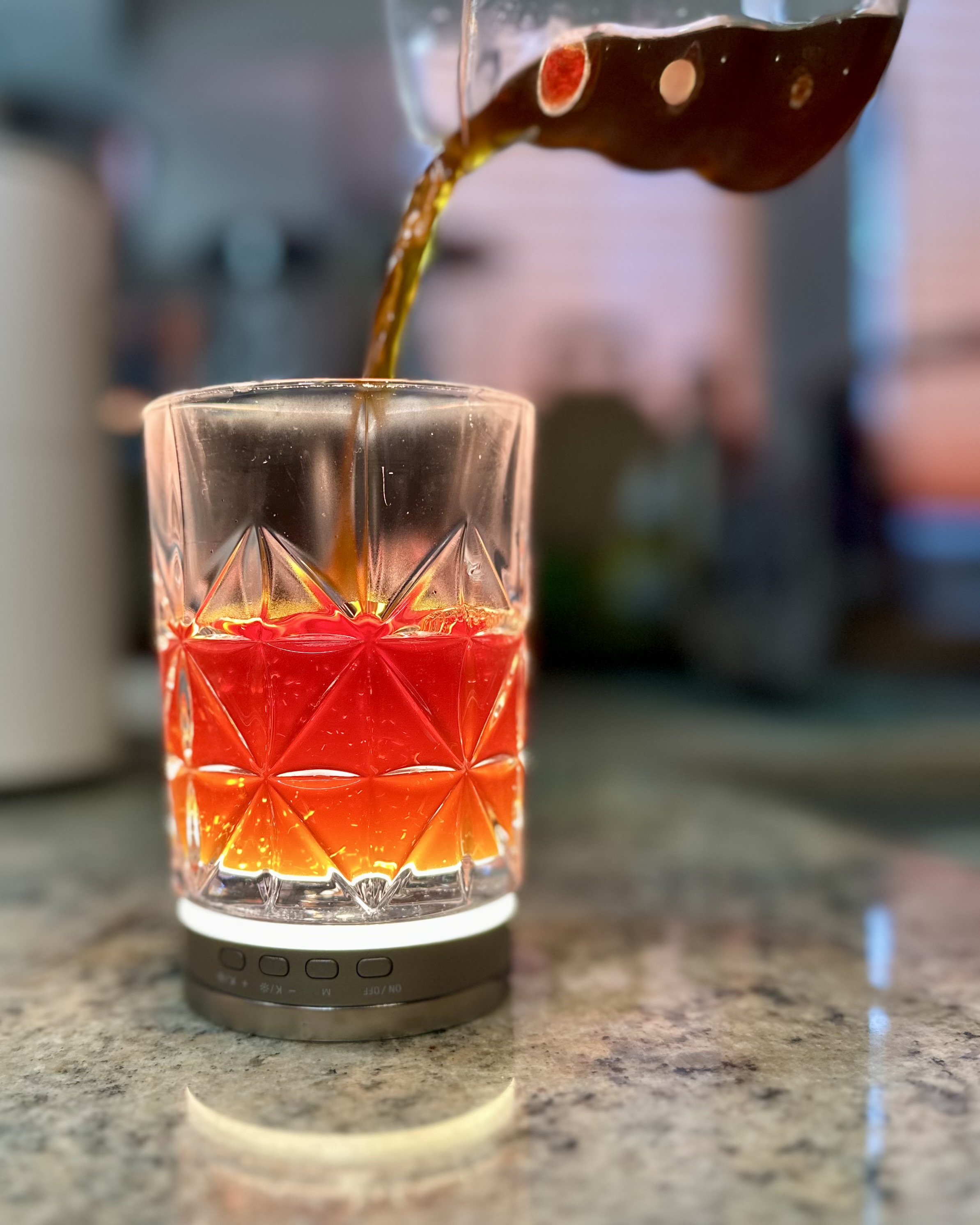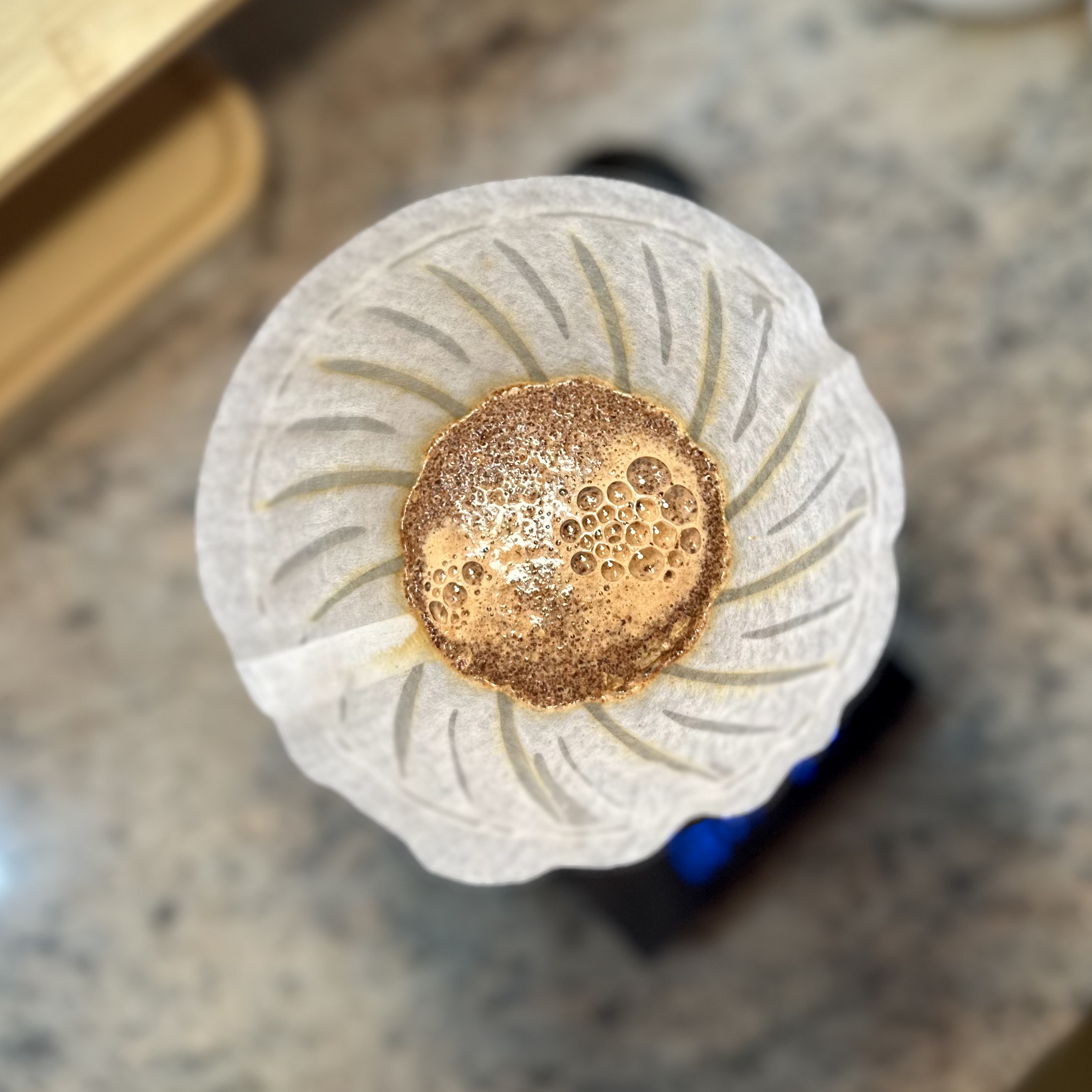 Das Brühen läuft wie beschrieben, sehr ereignislos ab. Im Vergleich zu dem Video habe ich die Brühung bei 3:00 Minuten abgebrochen, es stand noch Wasser über dem Kaffeebett. Die nächsten Brühungen werden bei 26 Clix ablaufen. (Zimt!) Für einen gewaschenen Kaffee ist dieser hier überraschend präsent. Ich vermute, die Bearbeitung mit Zimt macht hier den Wumms in den Kaffee und bringt Weihnachten in die Tasse bzw. das Glas. Ich mag es, bei besonderen Kaffees auch besondere Gläser zu nutzen, so kommen die Whiskygläser zum Einsatz, die haben ansonsten nie etwas zu tun.