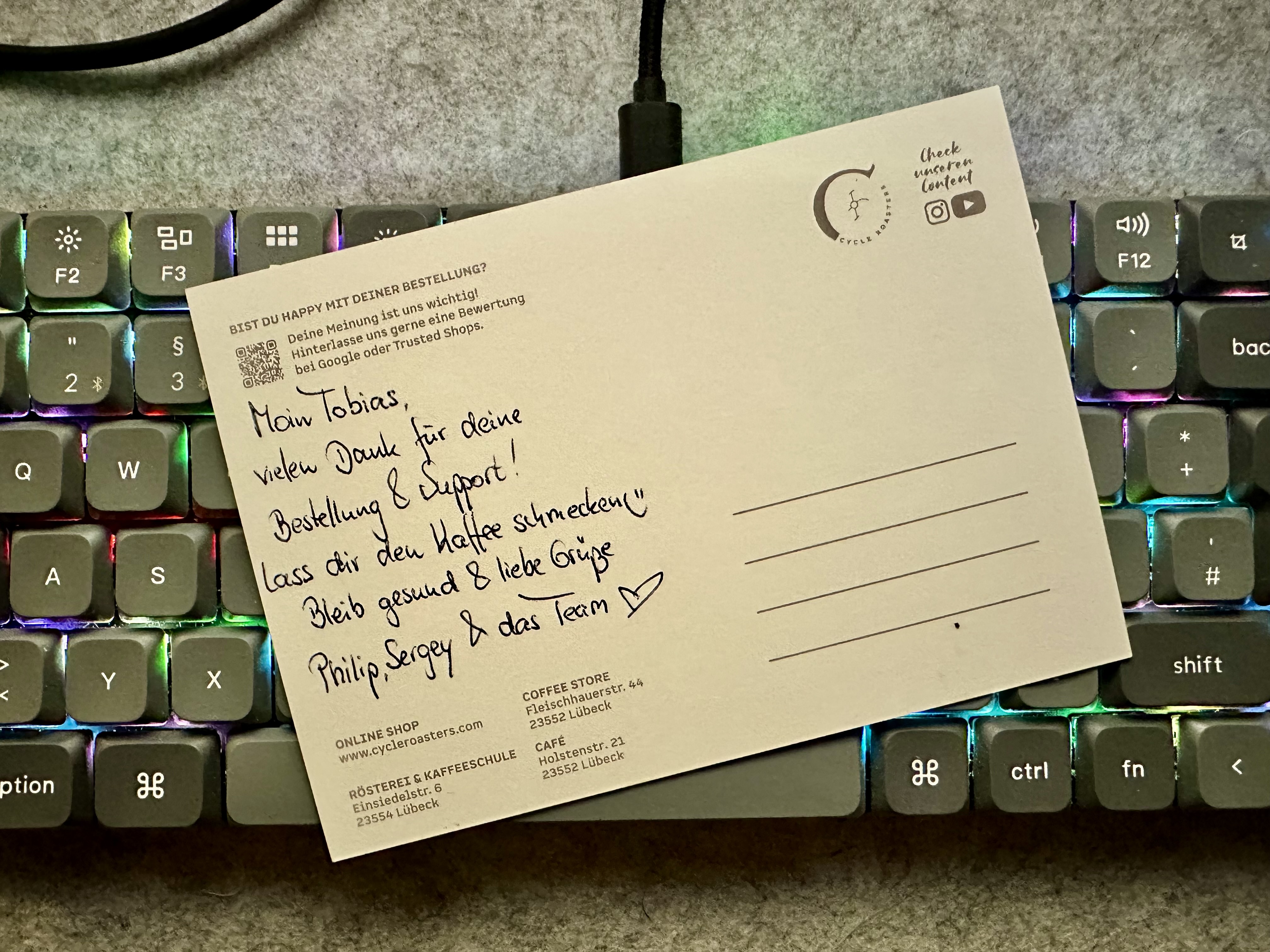 Die Cycle Roasters kenne ich aus Lübeck; während ich von der Bahn auf ein Schiff umsteigen durfte, hatte ich ein wenig Zeit und stromerte durch die Stadt. Eher per Zufall habe ich das Ladenlokal gefunden und mich dort sehr schnell sehr wohl gefühlt. Die nette Art der Menschen dort und der überragend gute Kaffee haben zusammen einen mehr als positiven Eindruck hinterlassen, welcher sehr dem anhält.