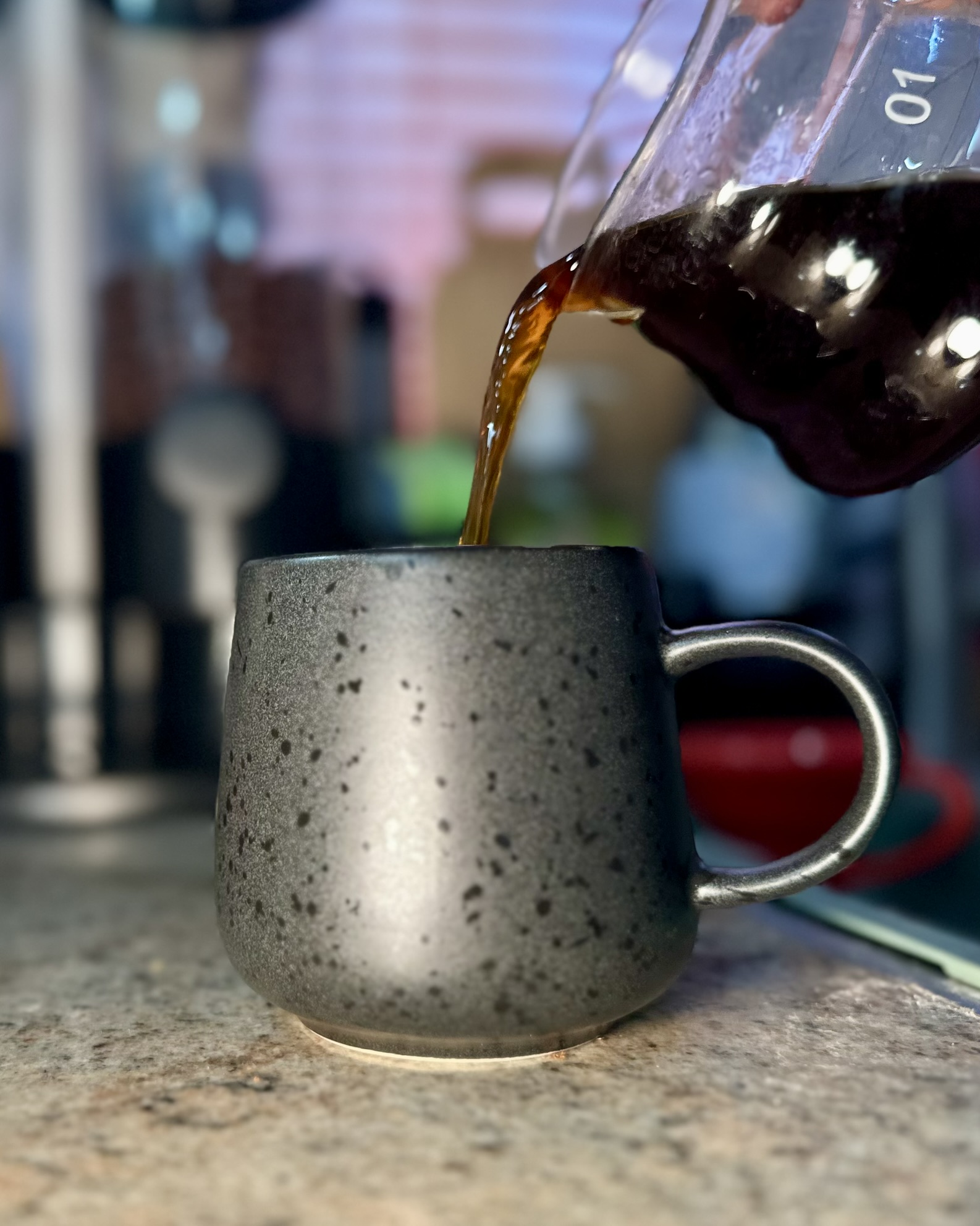 1g mehr Bohnen, 10g weniger Wasser und von 24 auf 21 Clix, das merkt man. Der Kaffee ist wesentlich intensiver, aber dank dem B75 nicht so stark, wie ich vermutet hätte, er läuft halt signifikant schneller als ein V60. Der Geschmack dunkel gerösteter Bohnen ist weiterhin, natürlich, vorhanden, wird aber durch sehr viel Süße ergänzt, welche im Prozess des Abkühlens noch zunimmt.