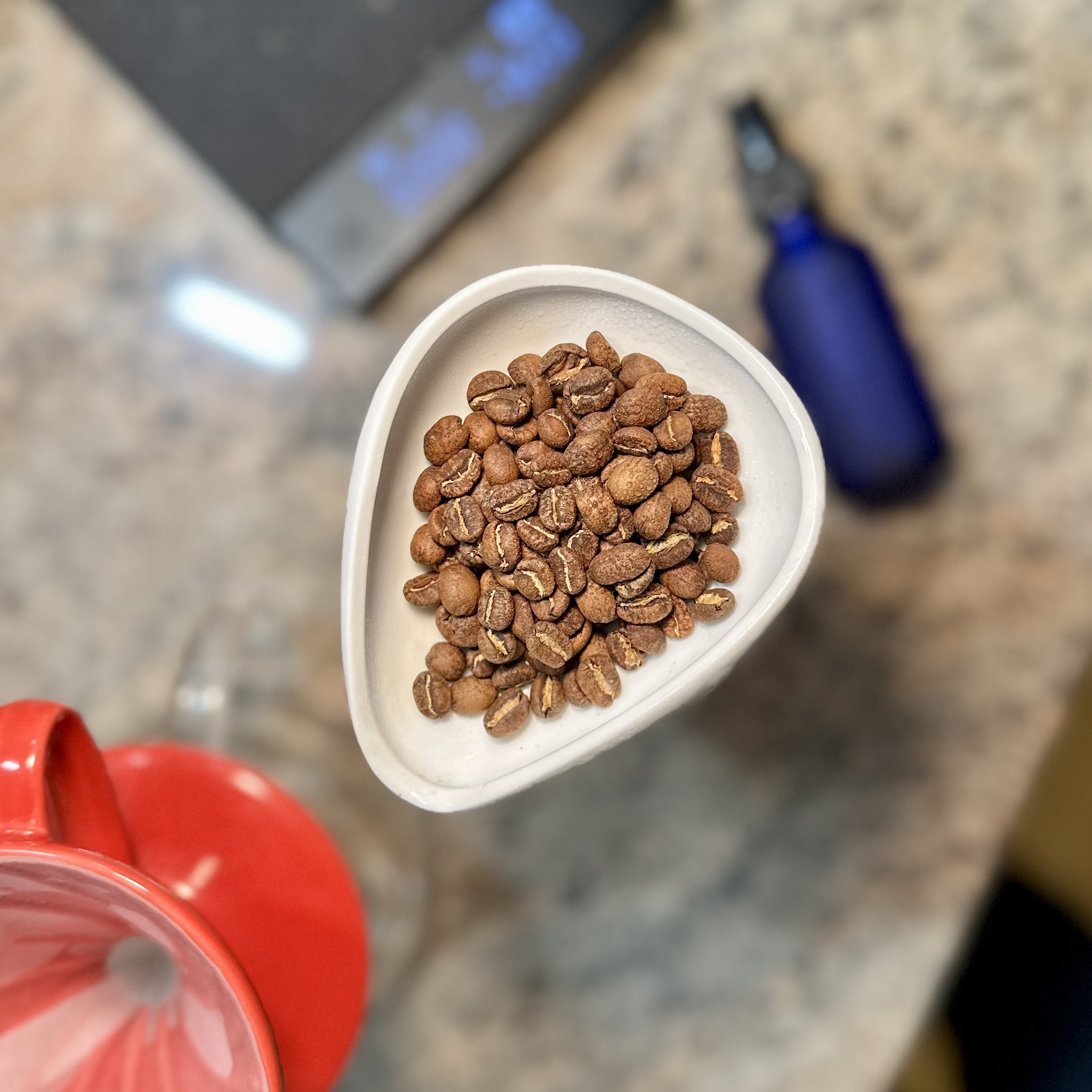 Der Röster rät zu einer Dosierung von 18g Bohnen zu 260g Wasser, was für mich recht viel ist, ich wäre auf 15-16g gegangen. Die Leute wissen aber von was sie schreiben, also folge ich natürlich dem Rat. Auch passe ich gerne meine Brühweise entsprechend an, es werden 2 große Aufgüsse empfohlen, also wird das Muster 50g + 100g + 100g angewendet. Die 10g mehr Wasser passieren eh, so eng nehme ich es nicht. Im Zweifel werde ich 10g mehr oder weniger Wasser eh nicht schmecken, wie vermutlich die meisten anderen auch nicht.