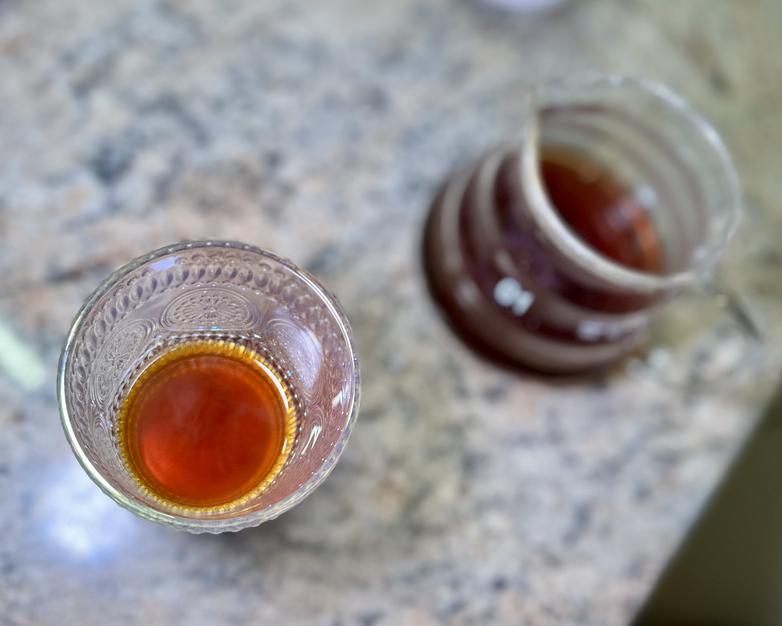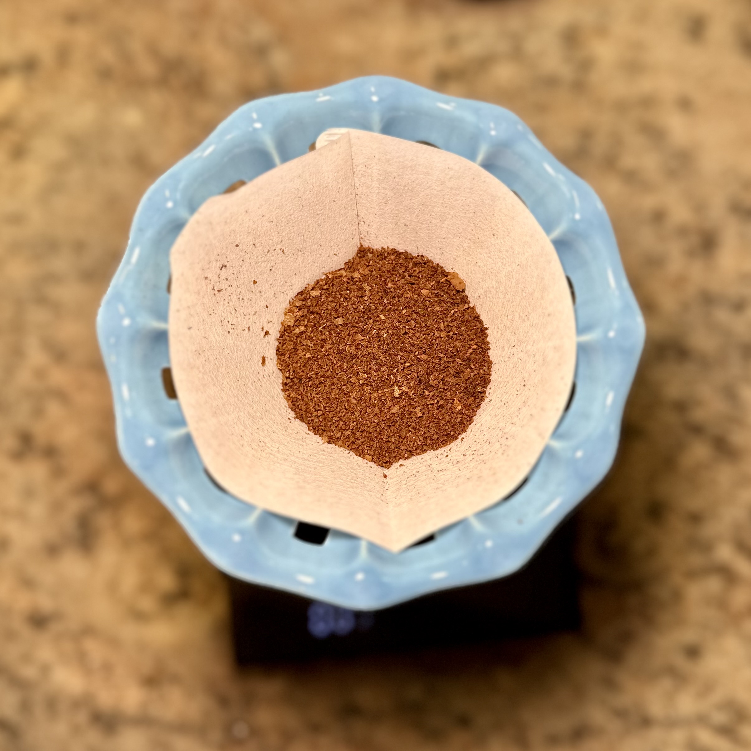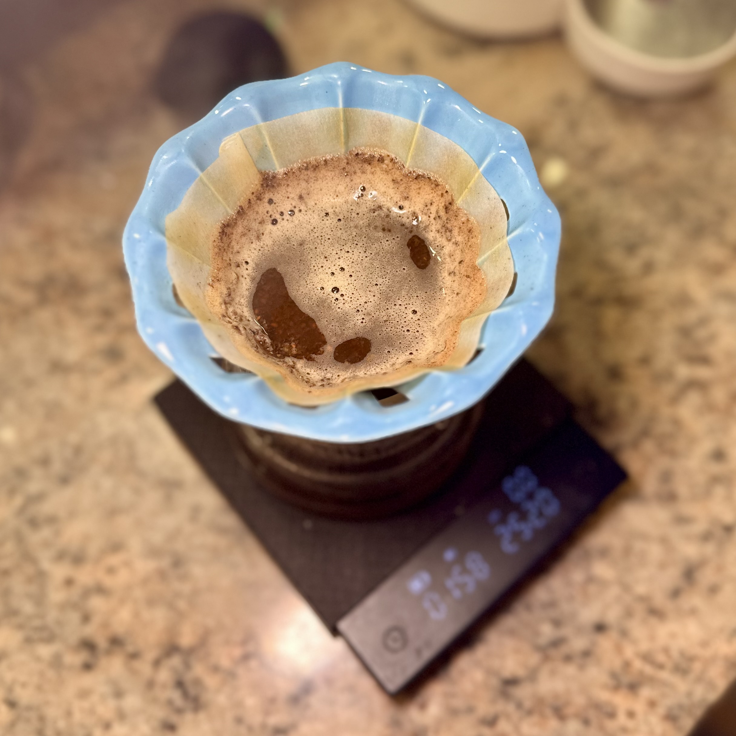Ich bin auf den V60 gewechselt, dadurch läuft der Kaffee schneller durch, ich komme nun bei knapp 2 Minuten raus. Der kratziger Hals ist weg. Beim Trinken selber schmecke ich kaum etwas, im Nachgang aber: hier ist klar wieder eine Kamille vorhanden und ein trockener Wein, den ich auch als Wein nicht trinken kann.