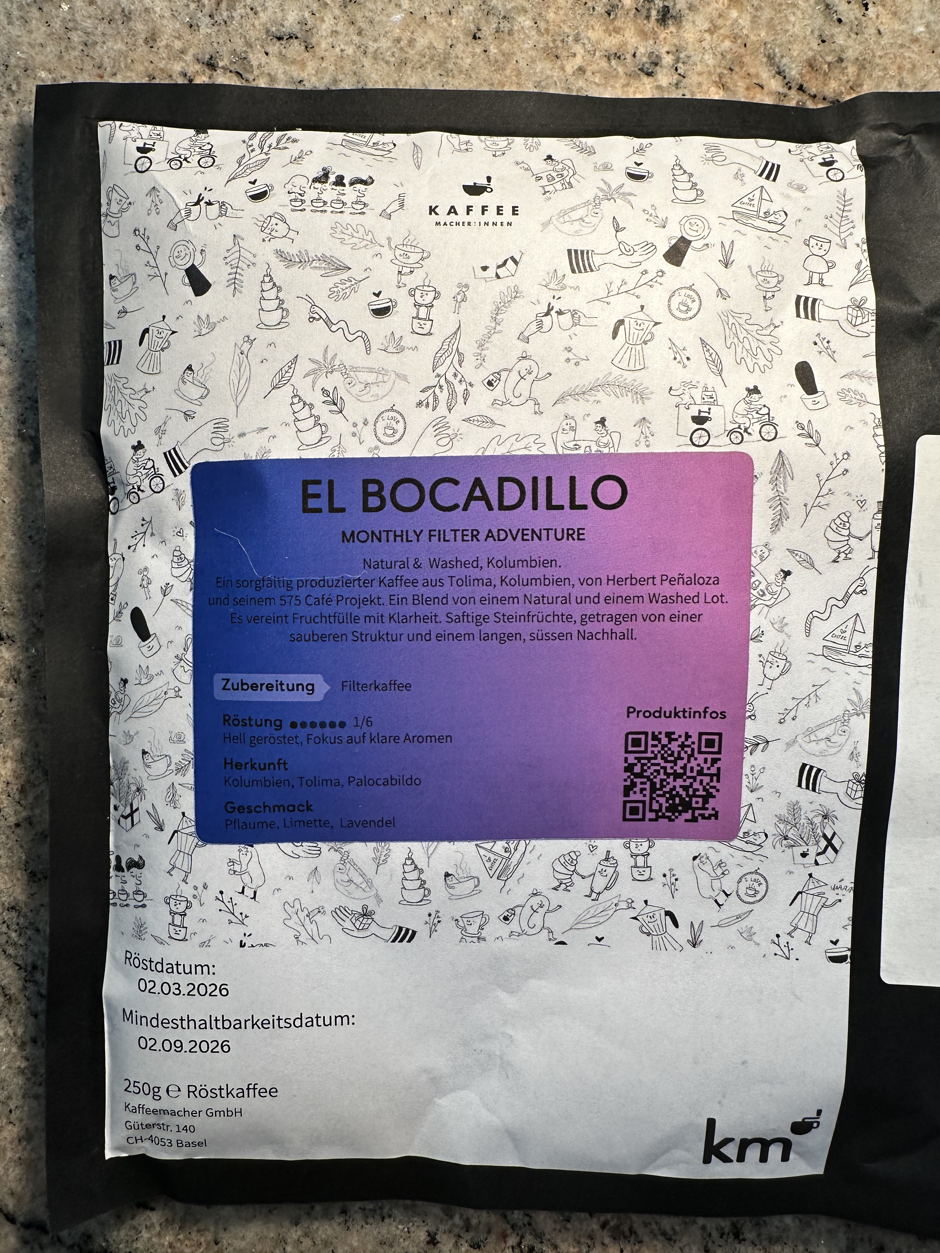 Im Rahmen des Abenteuer-Abos haben die Kaffeemacher einen Blend geschickt! Ich glaube, das hatte ich noch nicht, finde ich aber gut. Ich habe dieses Mal den Fehler gemacht und genau diese Info nicht gelesen, bevor ich die Bohnen umgefüllt habe. Beim Umfüllen gab’s dann die Verwunderung, wieso die Röstung scheinbar so ungleichmäßig ist. Die Verwirrung lies sich dann durch simples Lesen auflösen.