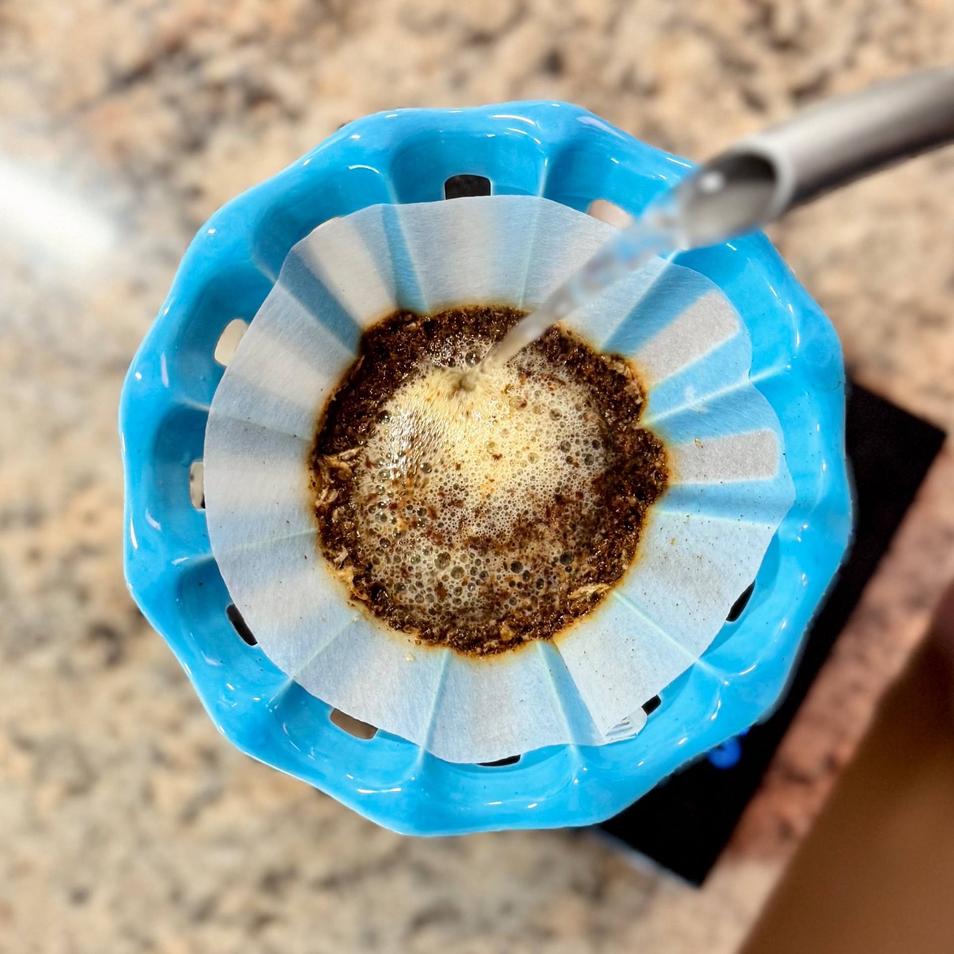 Ich habe mein Standardrezept angewendet: C40, 24 Clix, V60, 94°C, das Ergebnis war ein kleines Stück zu bitter. Nach der ersten Tasse habe ich auf 26 Clix korrigiert und habe damit den für mich passenden Punkt erreicht, an dem der Kaffee mich massiv überrascht, was ich vollkommen positiv meine. Im Dotyk gebraut läuft dieser Kaffee signifikant länger, hier habe ich bei 3:30 Minuten abgebrochen, das Wasser stand noch knapp 1cm über dem Kaffeemehl, da lief nichts mehr. Ein V60 ist hier hilfreich, damit es schneller läuft, Bypass hängt also nicht davon ab, wie spack der Filter am Filterhalter liegt.